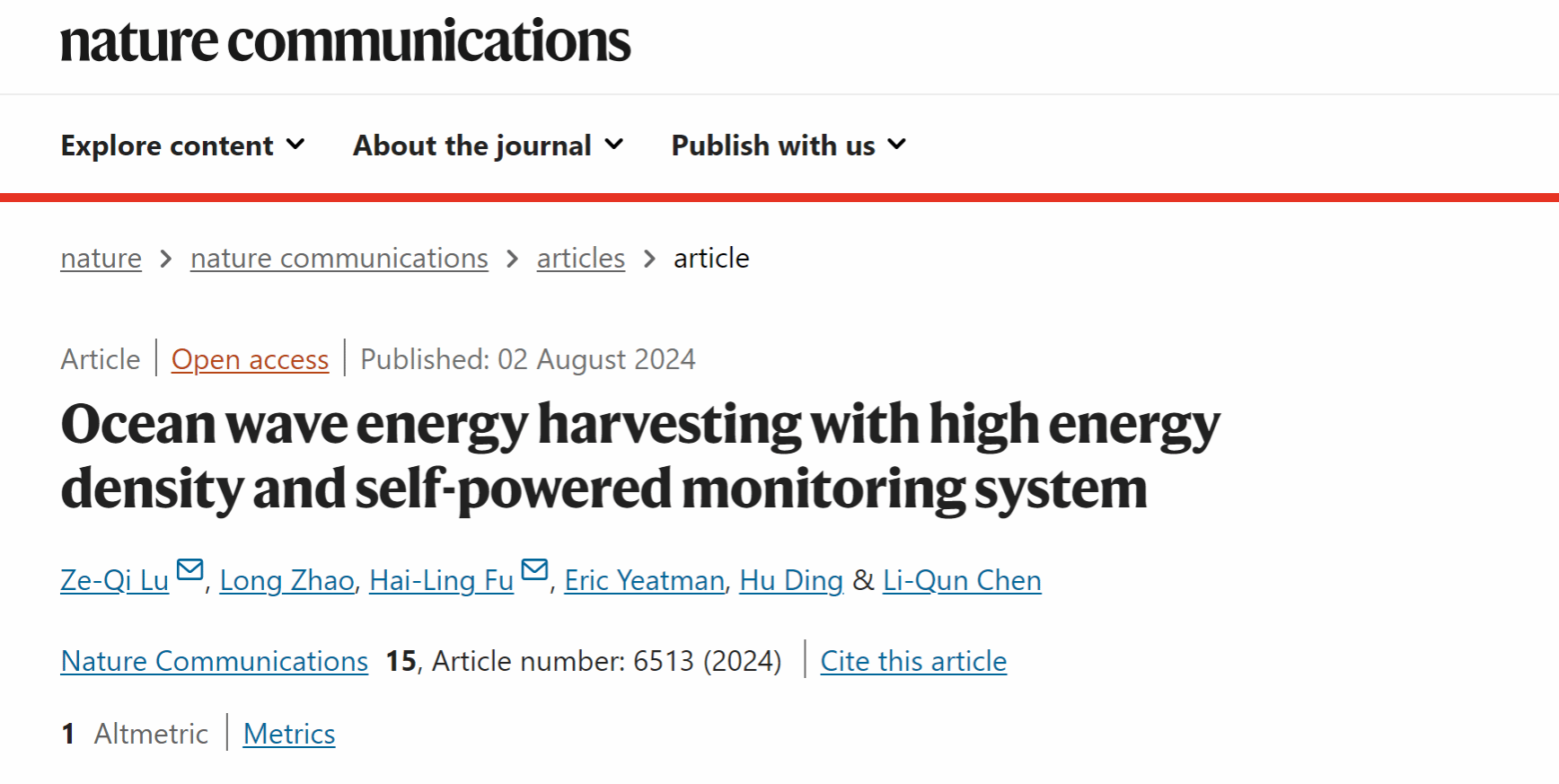 本研究获得国家自然科学基金(Nos. 12272210; 11872037; 11572182)的资助。全文链接:https://doi.org/10.1038/s41467-024-50926-5。论文索引信息:Lu, ZQ., Zhao, L., Fu, HL.,Yeatman, E., Ding, H., Chen, L. Ocean wave energy harvesting with high energy density and self-powered monitoring system. Nat Commun 15, 6513 (2024).